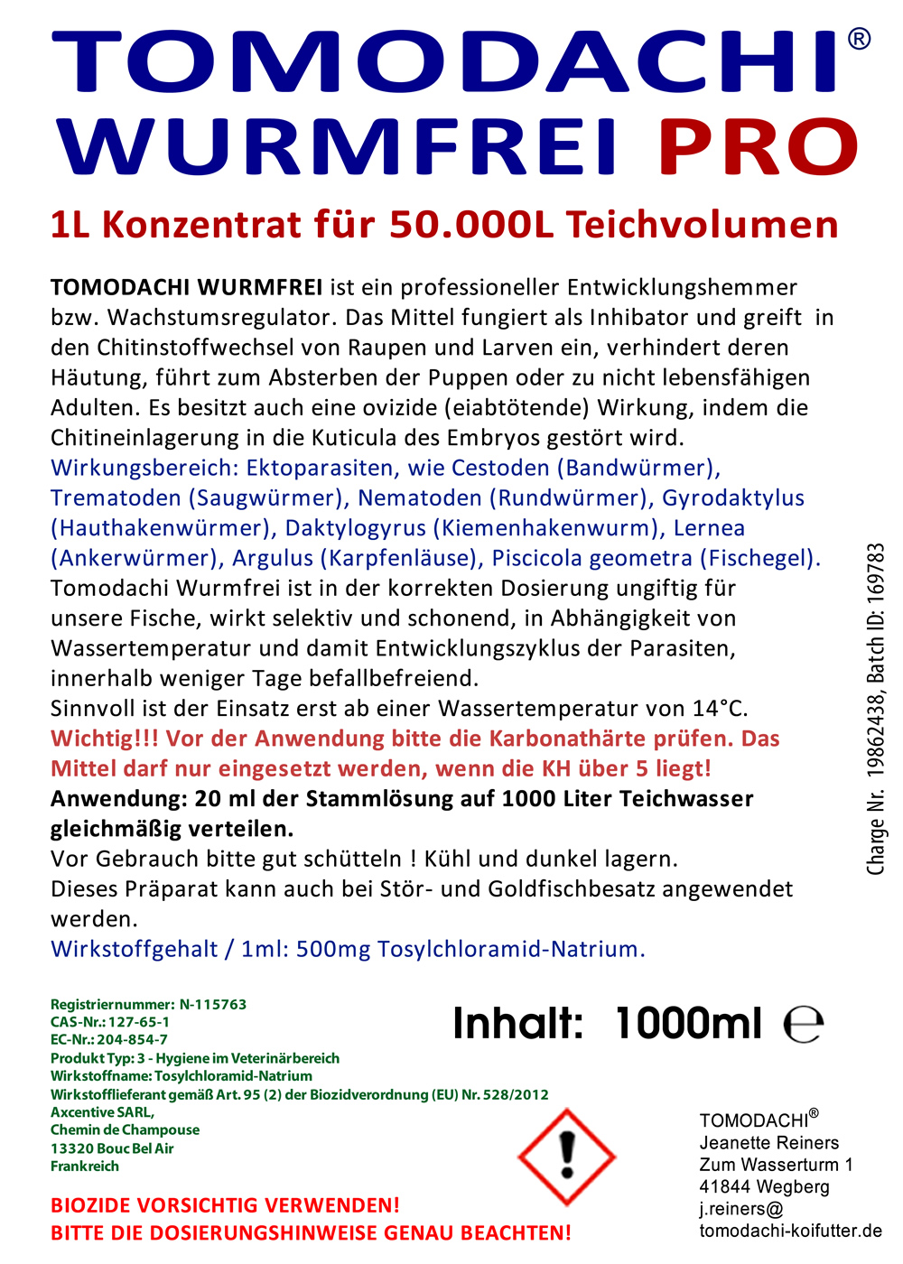 - vor der Anwendung bitte einen Wasserwechsel von 10% durchführen, um die Biolast im Teich oder Becken zu reduzieren und die Wirksamkeit des Wurmmittels zu erhöhen